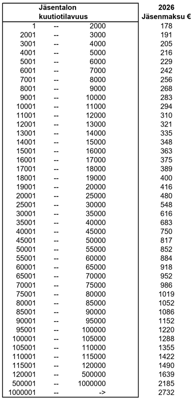 Jäsenmaksu perustuu jäsenen hallinnassa olevien ja omistamien rakennusten yhteistilavuuteen.