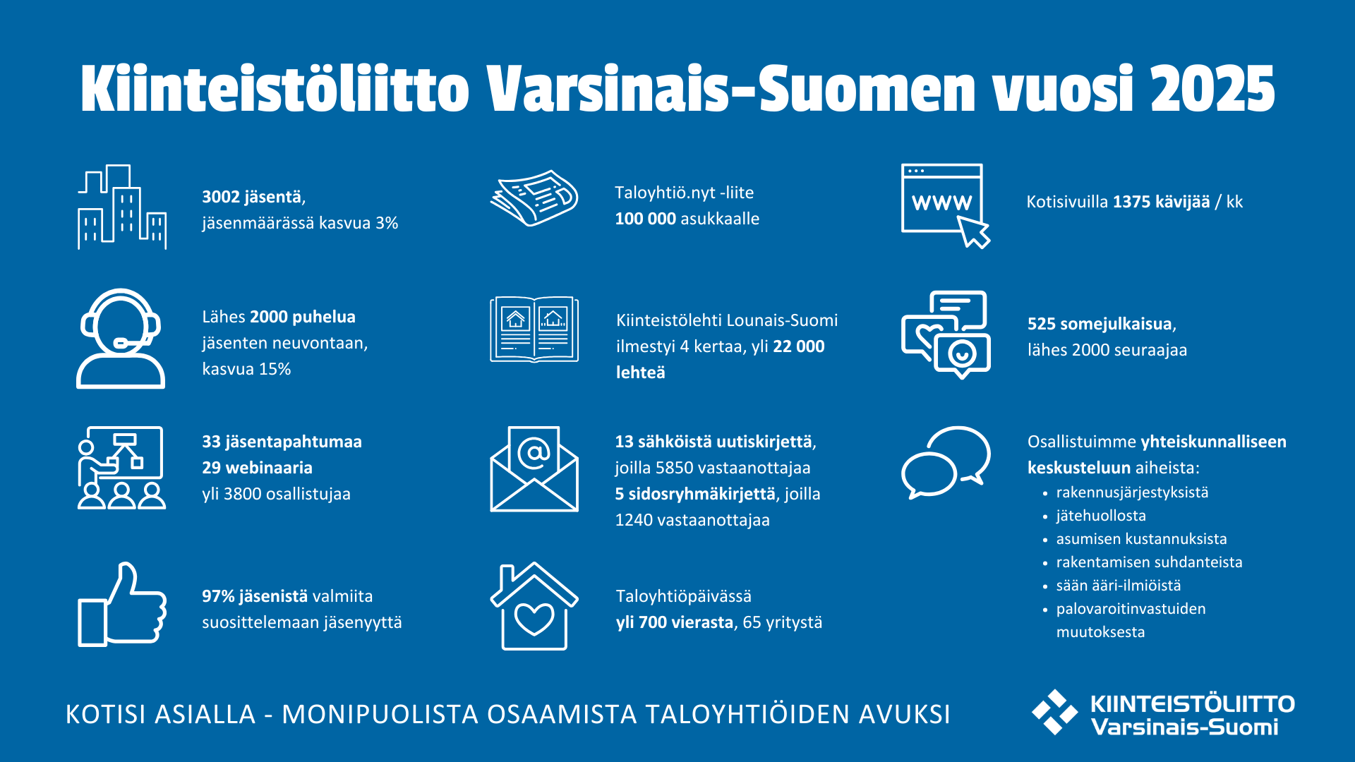 Kiinteistöliitto Varsinais-Suomen vuosikokouksessa 25.3.2026 käsiteltiin sääntömääräiset asiat eli hyväksyttiin yhdistyksen tilinpäätös, toimintasuunnitelma ja budjetti sekä valittiin hallituksen jäsenet erovuoroisten tilalle.